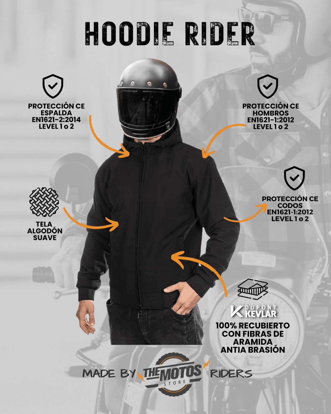 La nueva Chaqueta REBEL Hoodie Rider es la definición de comodidad y seguridad en una sola prenda.