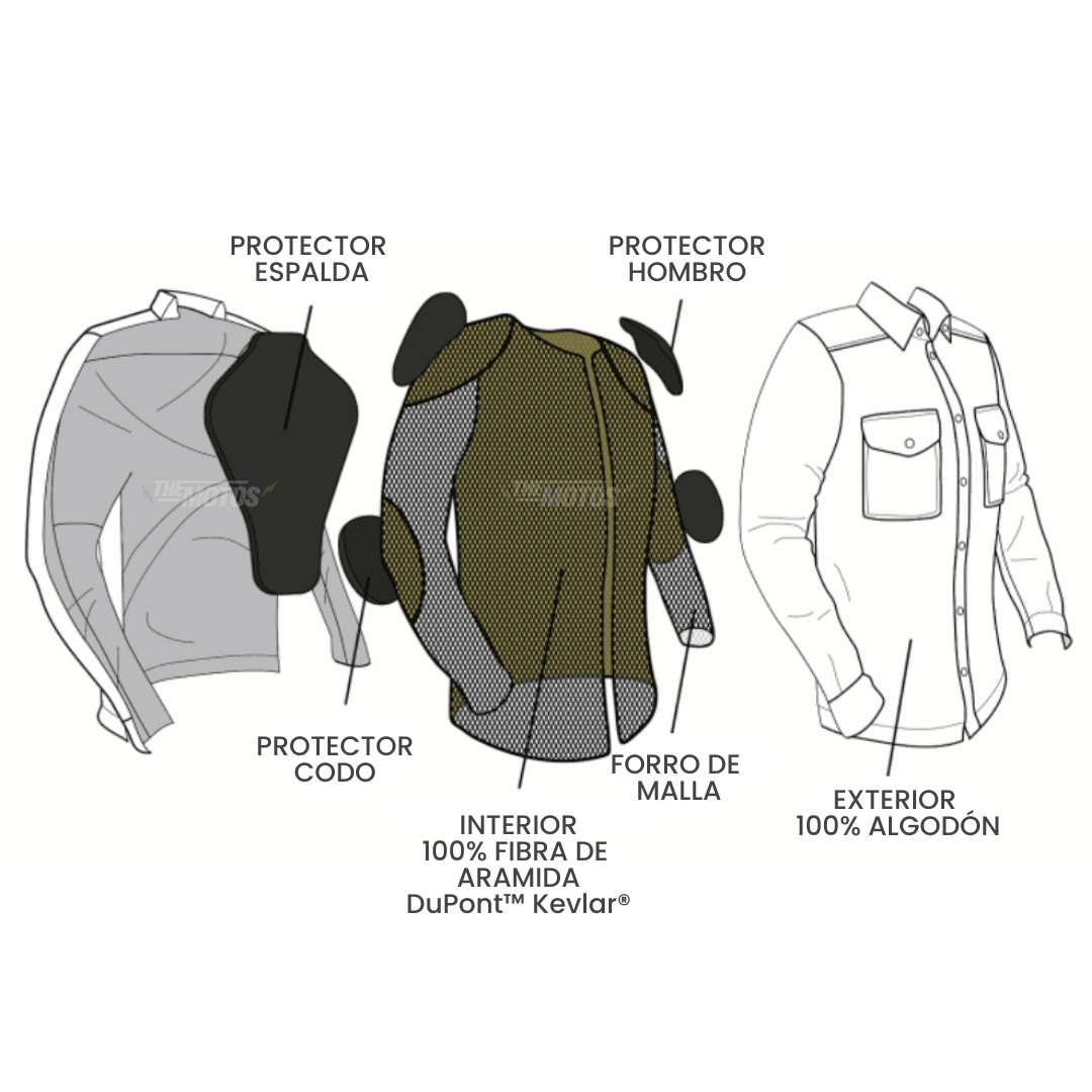Esta camisa se encuentra forrada con Kevlar, un material reconocido por su excepcional resistencia a la abrasión y durabilidad, Para una protección completa, viene equipada con protectores de espalda, hombros y codos.