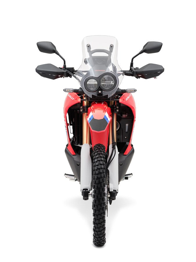 La CRF300 Rally 2025 está diseñada para los conductores más aventureros, agregando capacidad de largo alcance y comodidad a su rendimiento Off-Road. Se trata de una moto compacta de gran rendimiento, que combina la robustez y diseño de las motos de competición HRC CRF450 Rally con características diseñadas para el aventurero de a pie. Con un tanque de combustible de 12,8 L, ofrece un largo alcance, permitiendo viajes más extensos sin preocuparse por repostar. Su carenado frontal y pantalla flotante están diseñados para desviar el viento, mejorando la comodidad en rutas largas. Además, la protección contra los elementos es sobresaliente, gracias a su diseño aerodinámico y cubiertas laterales. Los faros LED dobles proporcionan visibilidad óptima tanto en carretera como fuera de ella. Su manillar ergonómico y la altura de asiento más baja garantizan una posición natural y cómoda, facilitando el control, y las inserciones de goma en los estribos mejoran la seguridad. Con todos estos detalles, la Honda CRF300 Rally 2025 está lista para cualquier aventura, brindando un paquete versátil y fiable para quien busque explorar nuevos caminos.
