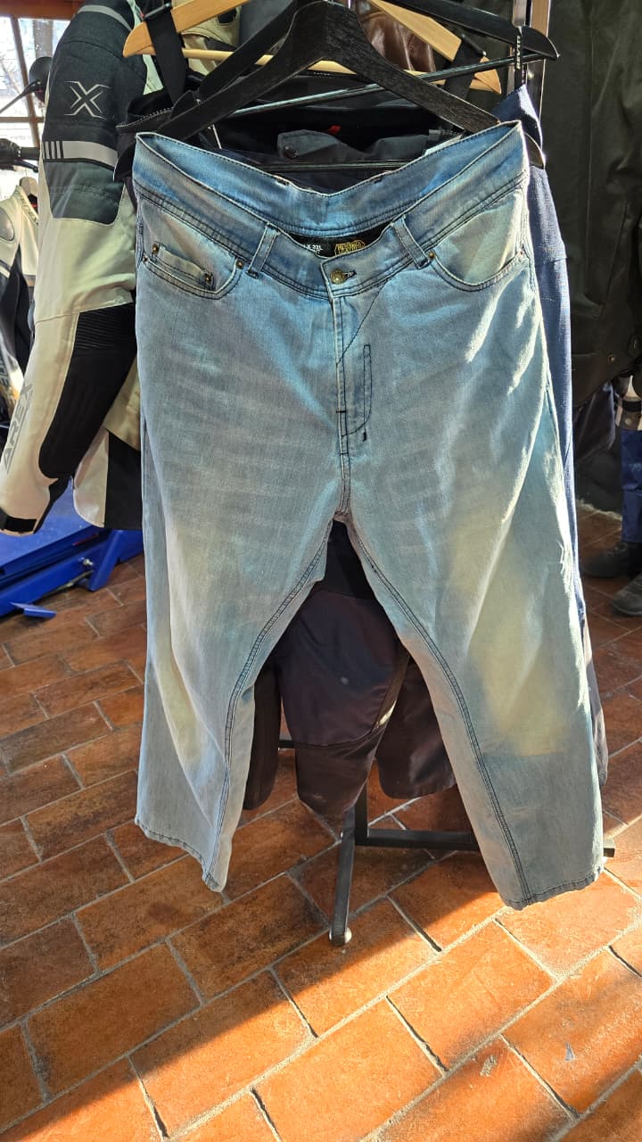 Pantalón tipo jeans en color celeste, diseñado para motociclistas que buscan estilo y protección. Cuenta con refuerzo de kevlar y protección en rodillas, ideal para rodar con seguridad y comodidad.