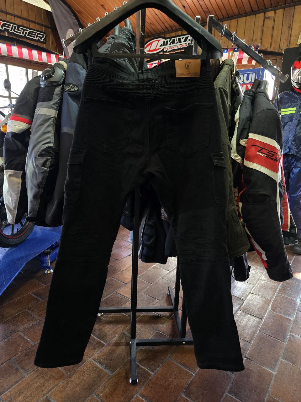 Pantalón para motociclista en color negro con detalles rojos, diseñado para ofrecer protección y confort en distintas condiciones climáticas. Incluye forro interno desmontable y protecciones en caderas y rodillas, combinando seguridad y funcionalidad en cada ruta.